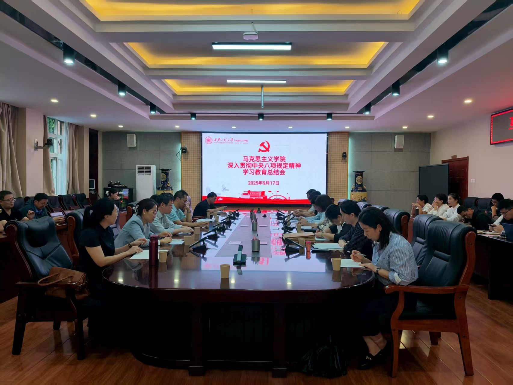 9月17日下午,马克思主义学院在金花校区第三会议室召开党委扩大会,全面总结深入贯彻中央八项规定精神学习教育开展情况,并对近期党建工作进行安排部署。会议由学院党委副书记(主持工作)傅博娜主持,全体教职工参会。