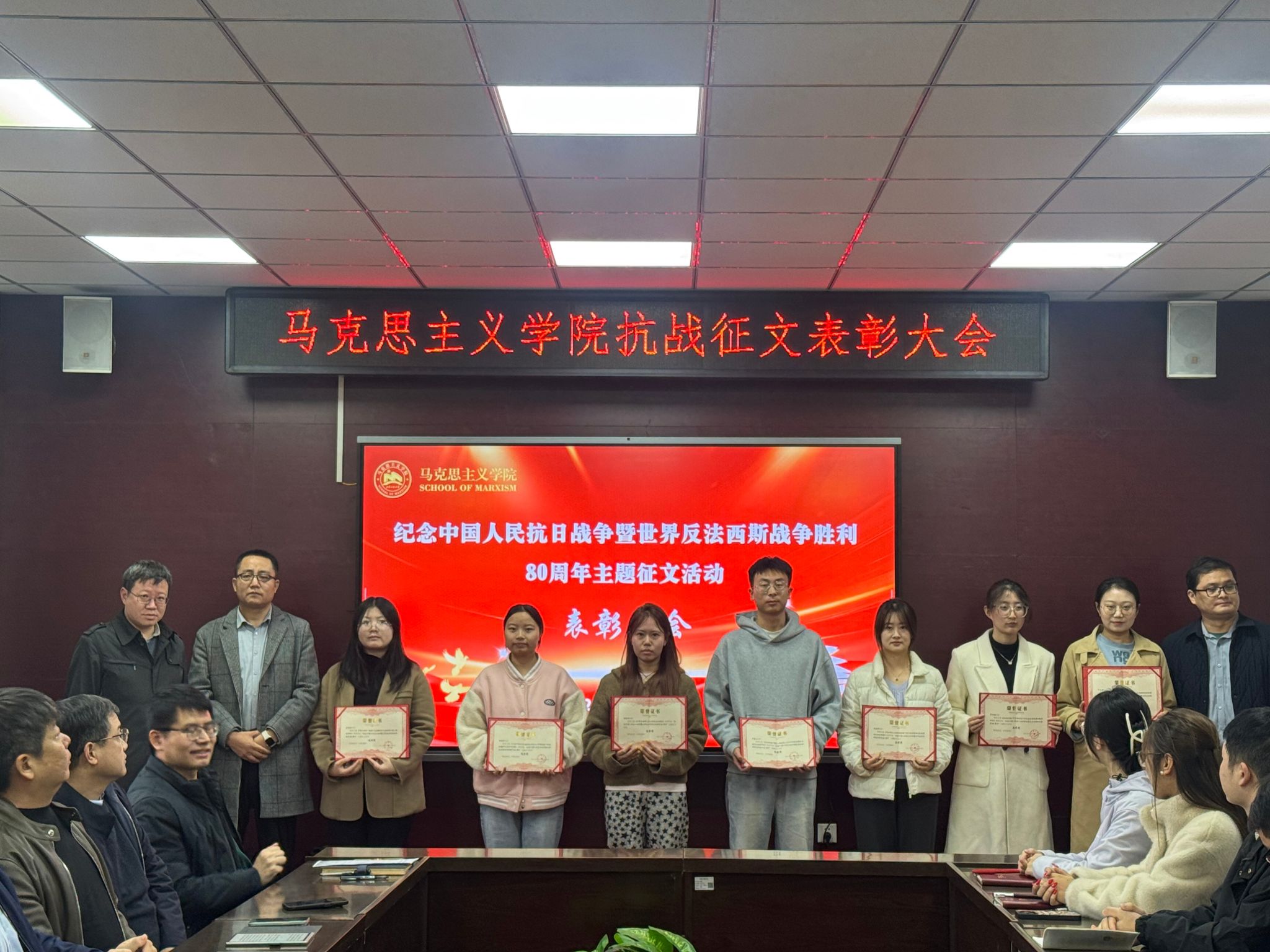 10月22日,马克思主义学院在203会议室举办“纪念中国人民抗日战争暨世界反法西斯战争胜利80周年”主题征文表彰活动。马克思主义学院党政领导班子成员、教师代表、硕士研究生参加表彰活动。