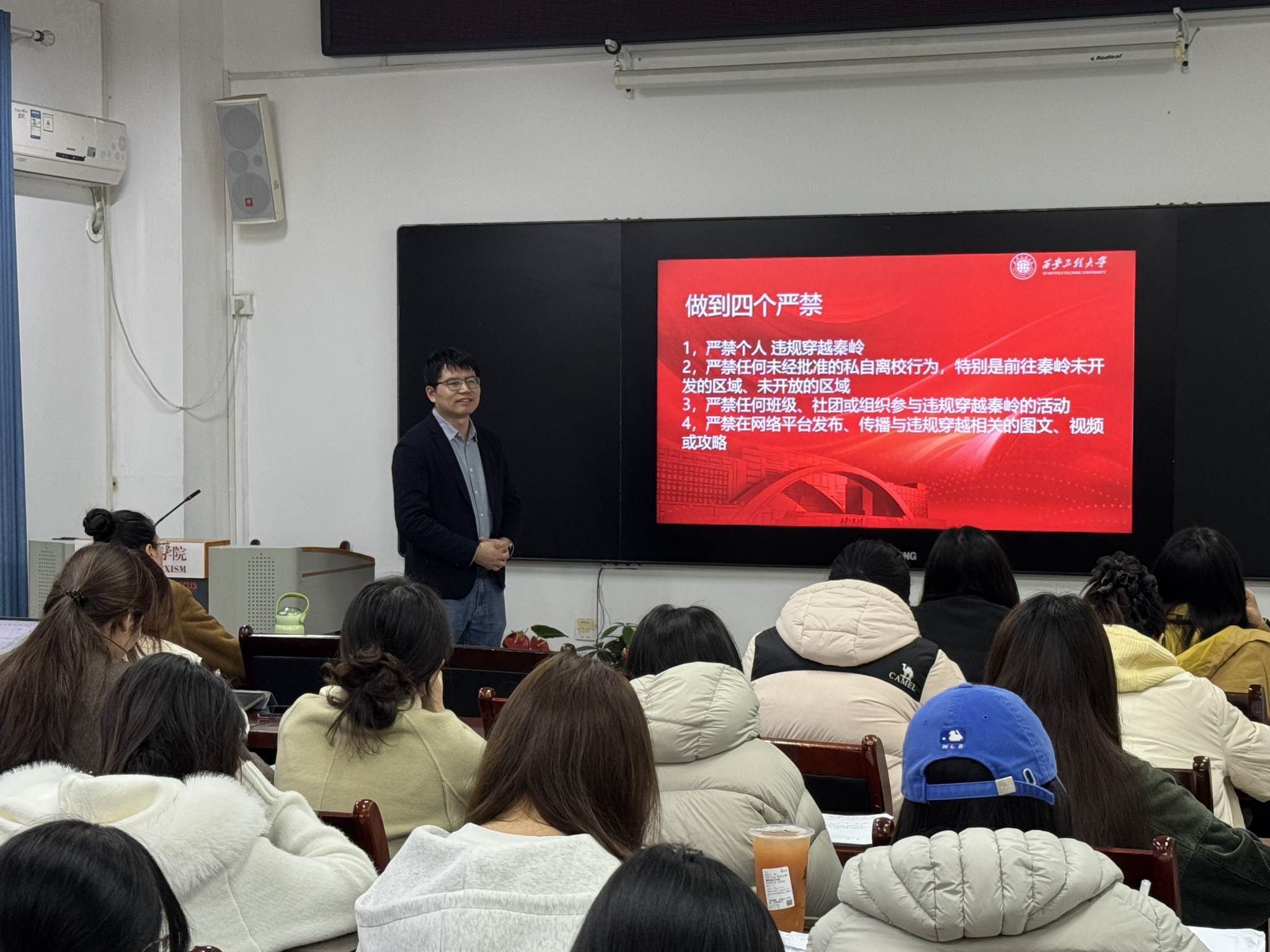 会上,梁育老师结合研究生群体实际,要求研究生牢固树立安全第一的观念,重点做到以下几点:一是要高度重视意识形态安全,提高网络安全意识,防范网络及电信等各类诈骗;二是要求严格遵守校园交通规则、规范电动车骑行以保障出行安全;三是开展“敬畏生命,守护秦岭”专题安全教育,要求全体同学切实爱护秦岭生态环境,禁止组织和参加违规秦岭穿越探险,切实保护好人身安全;四是毕业生求职过程中,需通过正规渠道获取招聘信息、仔细辨别用人单位资质,切实防范就业风险。