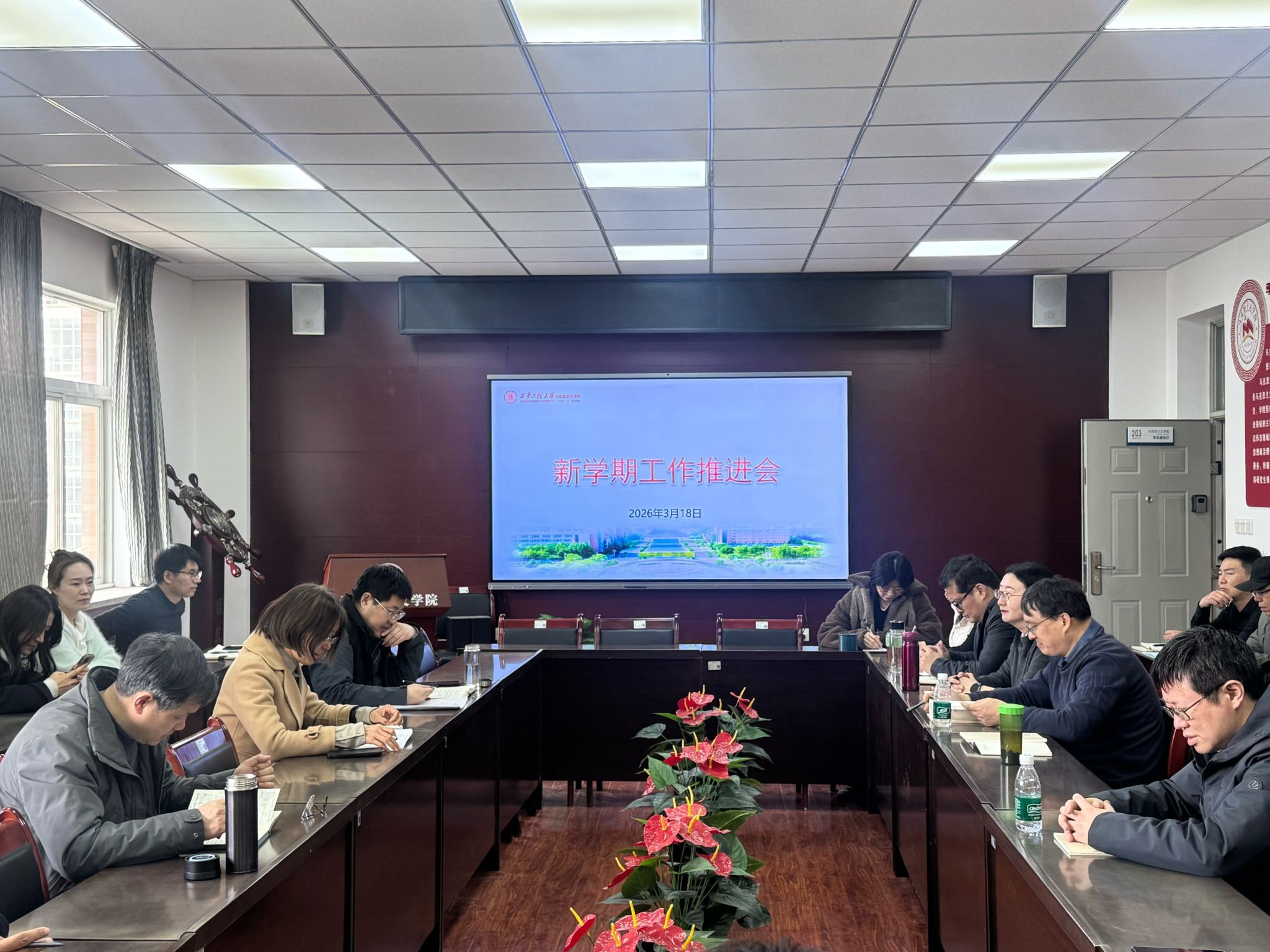 3月18日,马克思主义学院在临潼校区学院会议室召开新学期工作推进会。会议传达了学校2026年工作部署会精神,进一步明确学院重点任务与发展目标,全面梳理工作思路,确保各项工作任务有序推进。学院全体教职工参加会议,会议由学院党委副书记傅博娜主持。