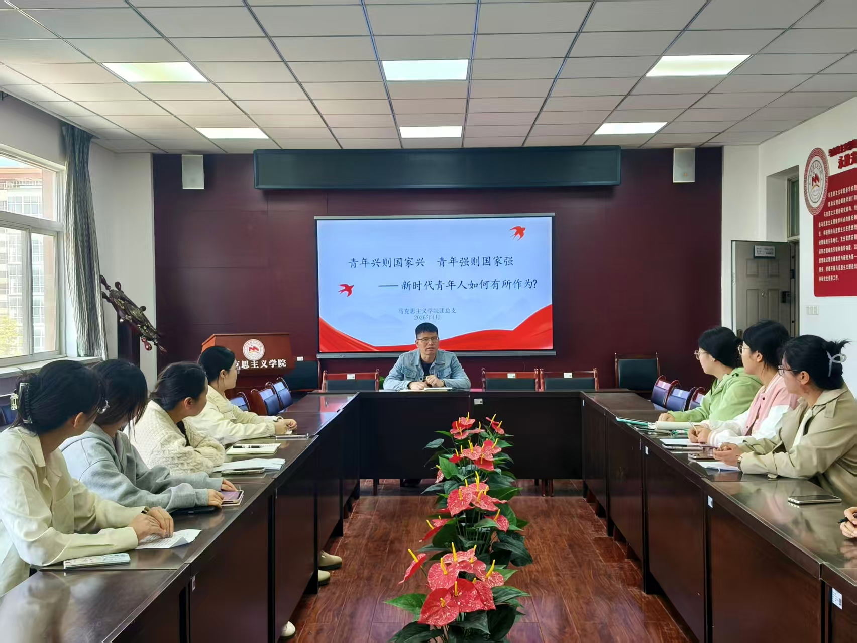 4月16日下午,马克思主义学院团总支在人文楼203会议室举行主题团日活动,学院团总支书记梁育主讲“青年兴则国家兴 青年强则国家强——新时代青年人如何有所作为?”题目主题团课,2024级全体入党积极分子参加会议。